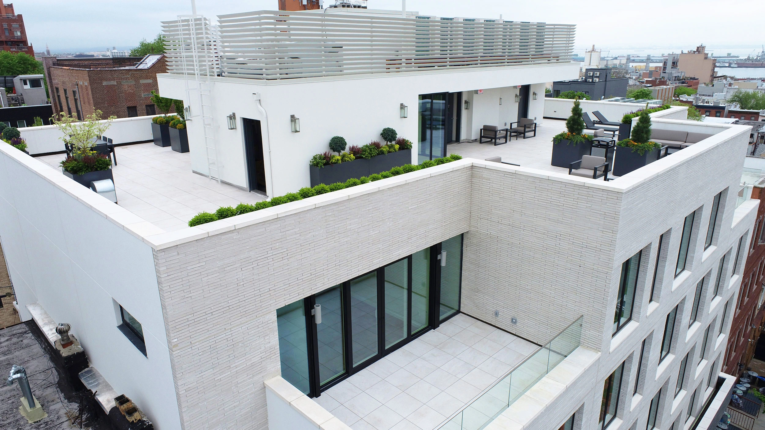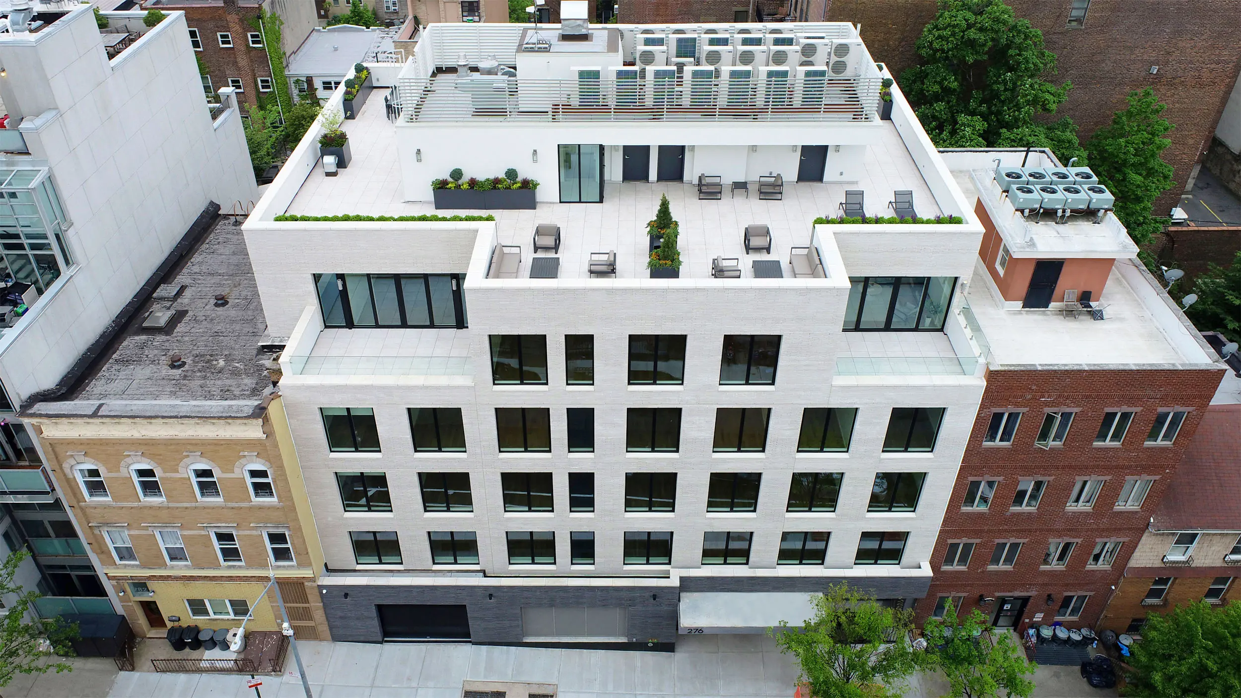 Amenities were planned to support both community and individual needs. Residents share a communal room for gatherings and celebrations, a gym with children’s playroom, bike storage, and a rooftop terrace with views of Lower Manhattan. Private terraces and penthouse roof decks offer additional outdoor space, balancing privacy with opportunities for social connection.