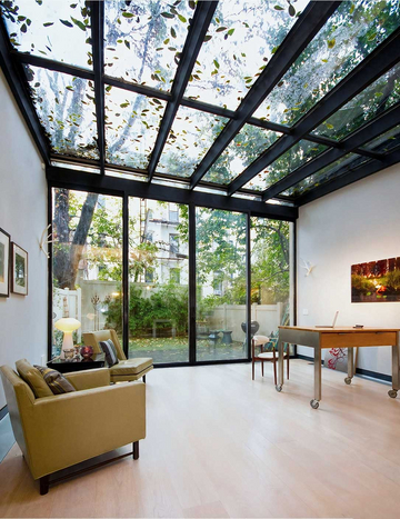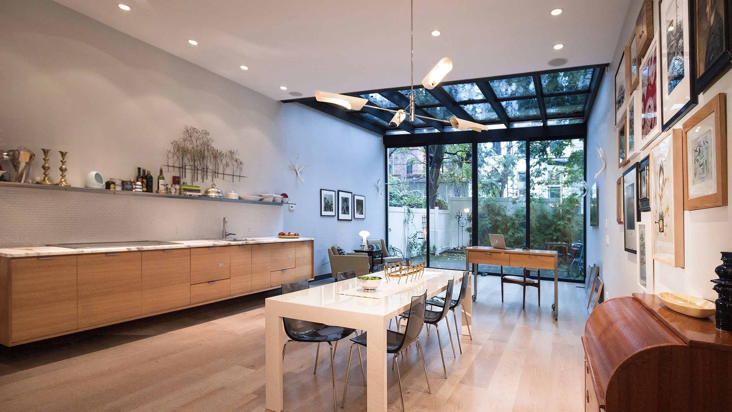 The renovation and enlargement of this 1910 classic brownstone in Park Slope features a glass and steel extension, adding space for a large kitchen, dining and living room. The openness towards the backyard and the large set of sliding doors provide a seamless transition to the outdoors and make the garden floor into a light-filled, serene space which allows for a rejuvenating escape from a busy city life.