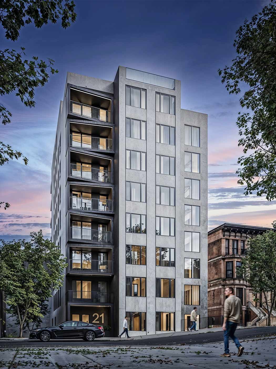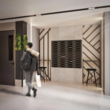 The façade design creates an architecturally appealing envelope which distributes lotline windows along both sides of the building to visually activate all four elevations. The building entrance is marked with a row of angled balconies which provides a distinct architectural character thus allowing residents to identify with their building.