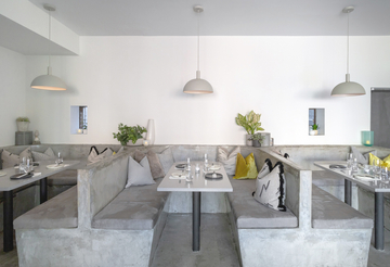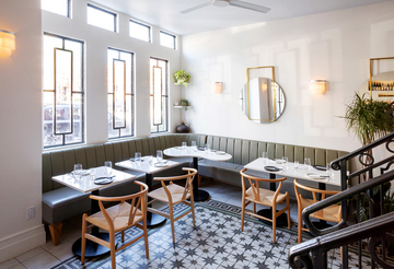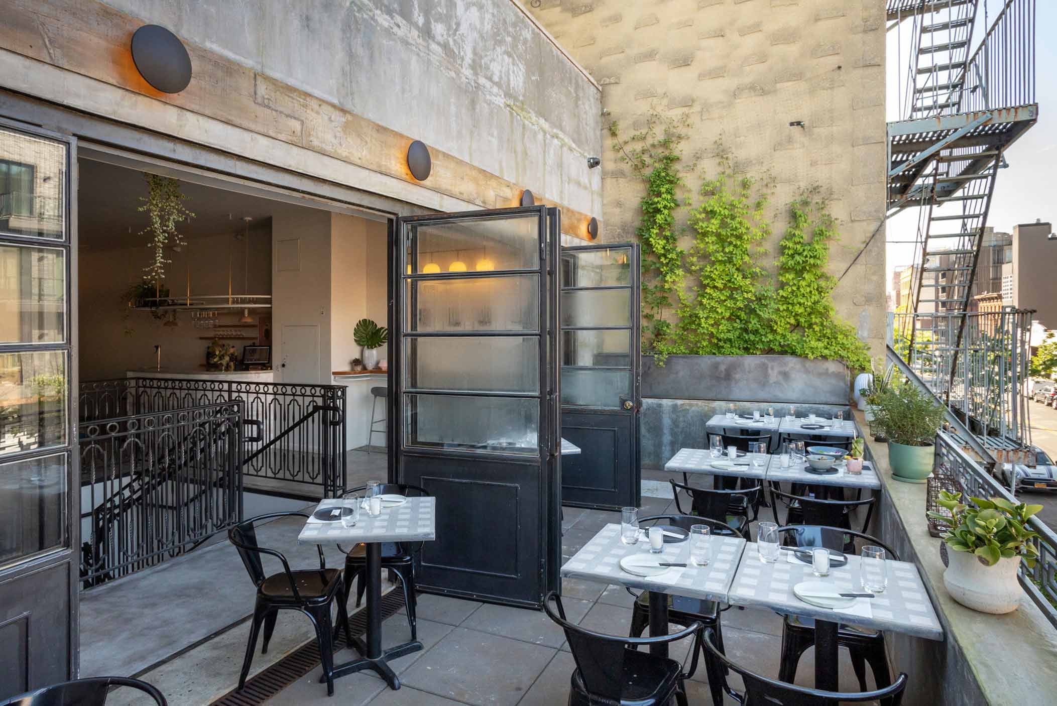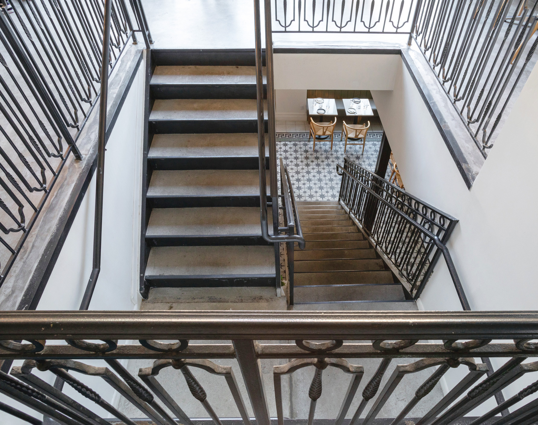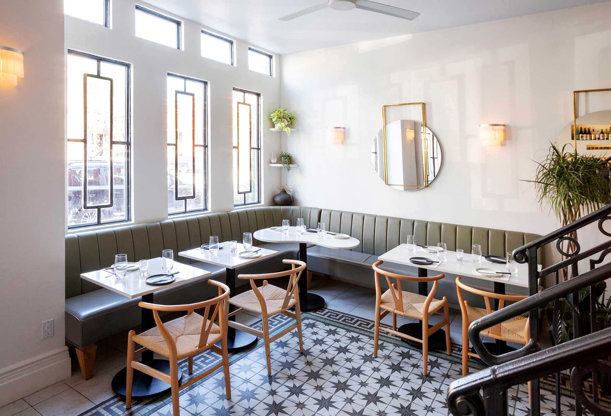 The building was reimagined with a two-level dining experience connected by an open stair and culminating in an outdoor terrace on the second floor. The layout creates both intimacy and energy, offering spaces that can shift from quiet meals to lively gatherings.